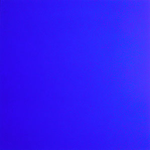 Das Bild Blue ist aus vielen hundert, in alle Richtungen vertriebenen Lasuren mit unterschiedlichen Tonwerten aufgebaut. Das leuchtende, schwebende Farbfeld öffnet sich bei etwas längerem Betrachten. Es erscheinen neue, physiologisch bedingte Simultankontraste aus dem gesamten Spektrum, im Verbund mit dem faktisch präsenten und zunehmend komplexer wirkenden Blau. |