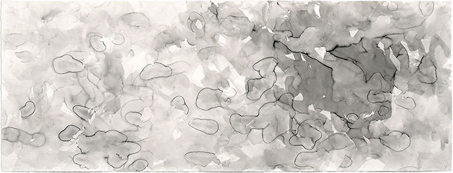 Die im Freien gemalte Reihe Movement entsteht im strahlenden Licht des kalifornischen Sommers. Diese Bilder zeigen Reaktionen zwischen chinesischer Tusche und Wasser, die ich über drei Monate mit einem sieben Meter langen Bambusrohr auf Büttenpapier aufbrachte. |