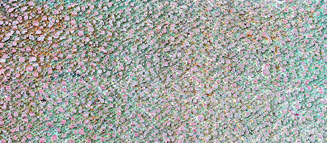 Der diffuse, je nach Lichteinfall wechselnde Gesamteindruck des Bildes Pneuma resultiert aus seiner reliefartigen Malschicht, die aus hunderten hauchdünnen Farblagen besteht. Die einzelnen Tonwerte der Schichten umfassen das gesamte Farbspektrum. Die Arbeitsrichtung wechselte lagenweise. An jedem Punkt der Bildfläche blieb pro Schicht immer nur eine rudimentäre Farbspur stehen. |